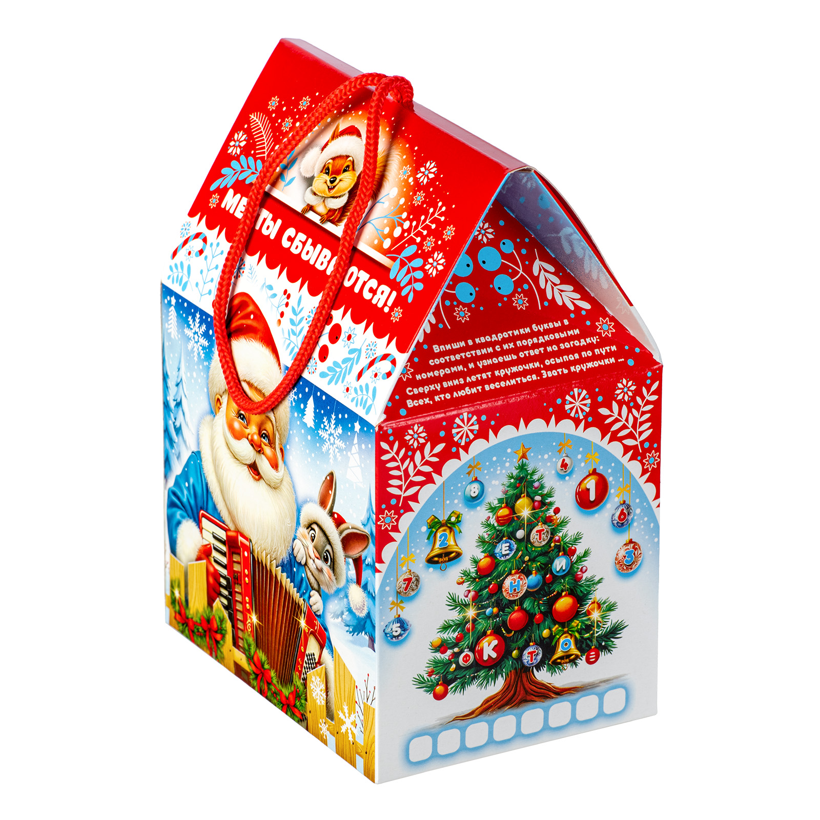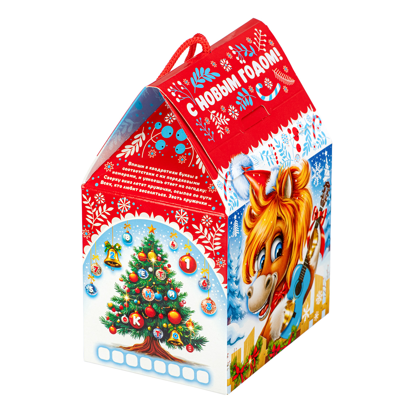 Этот компактный подарочный набор с удобной ручкой-шнурком идеально подходит для праздника в детском учреждении. Упаковка выполнена в сочетании ярко-красного цвета с различными холодными тонами, что придает ей привлекательности. На передной части мы видим забавную иллюстрацию с главным героем - веселым рыжим жеребцом Кешей, который держит в руках небольшую голубую гитару и, видимо, репетирует песню для новогоднего праздника. Внутри подарок также прекрасен: в его состав входит 600 грамм разнообразных лакомств и небольшой памятный сувенир, который еще долго будет напоминать всей вашей семье об этих замечательных праздниках.