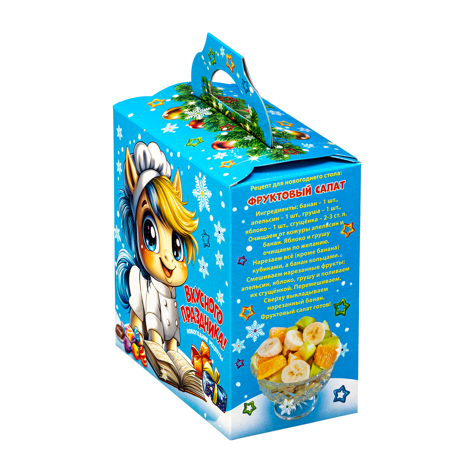 Ищете новогодний сладкий подарок для праздника в детском саду? Обратите внимание на набор “Поваренок Гоша”. За счет небольших размеров и грамотно подобранного конфетного состава этот подарок идеально подойдет для деток дошкольного возраста. Это коробочка нежно голубого цвета, со всех сторон украшенная разнообразными фигурными снежинками. На фронтальной части набора есть довольно милый рисунок: маленький очаровательной жеребенок в поварском кителе, который изучает книгу рецептов. Справа на упаковке как раз напечатан один из рецептов этой волшебной книги - обязательно приготовьте этот салат на новогодних праздниках!