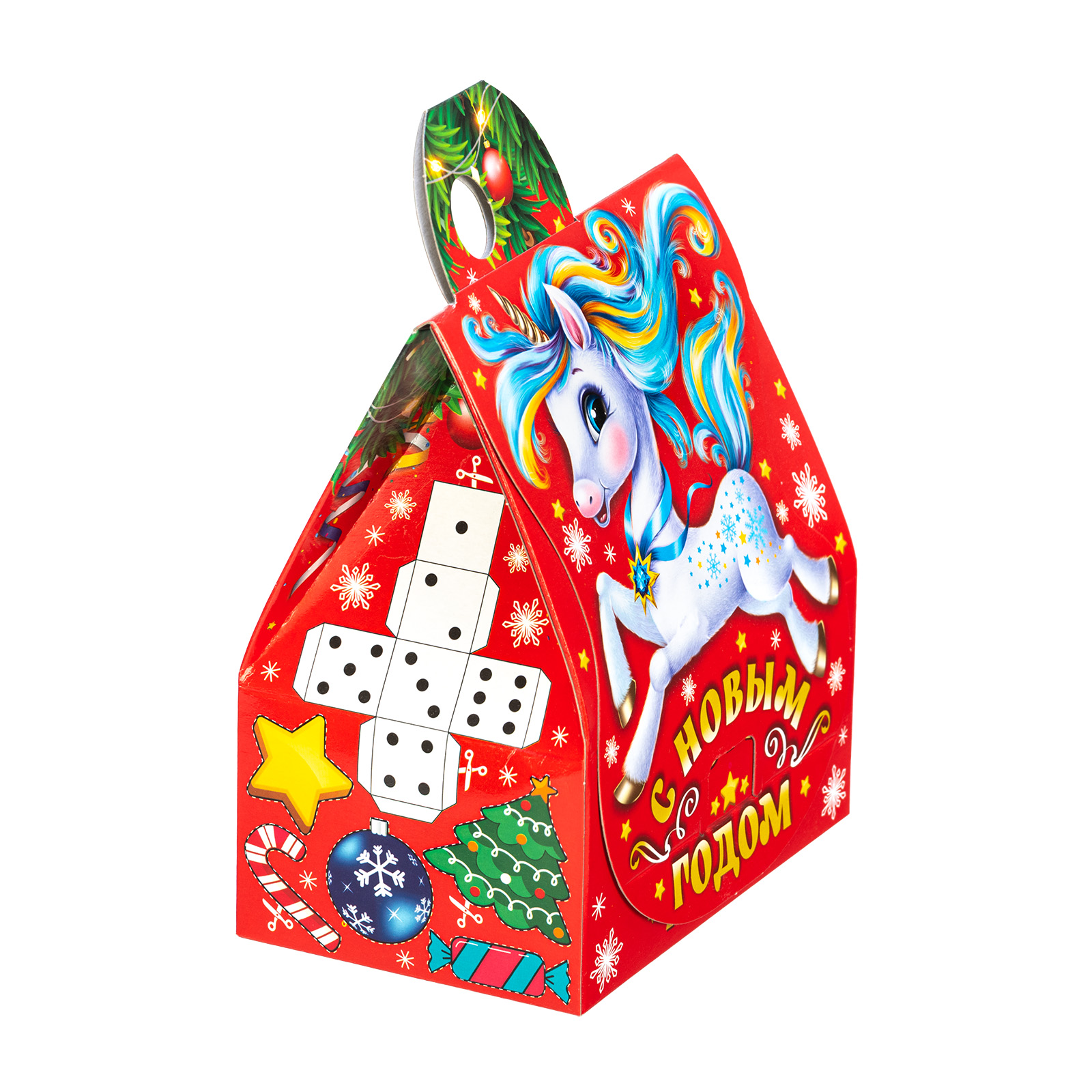 Ищете небольшой, но при этом очень вкусный сладкий подарок для детского праздника? У нас есть для вас предложение! Набор “Сказки лошадки” - это то, что гарантированно вызовет восторг у маленького сластены. Это небольшая картонная коробочка в форме уютного домика с удобной ручкой сверху. Фон упаковки - празднично красный, на нем со всех сторон присутствуют узнаваемые новогодние рисунки: снежинки, салют, елочные шарики, а на передней части главное украшение - иллюстрация в виде маленького сказочного единорога с разноцветной волшебной гривой. Внутри подарка находятся вкусные отборные сладости под любые предпочтения маленького сластены, а также небольшой памятный сувенир.