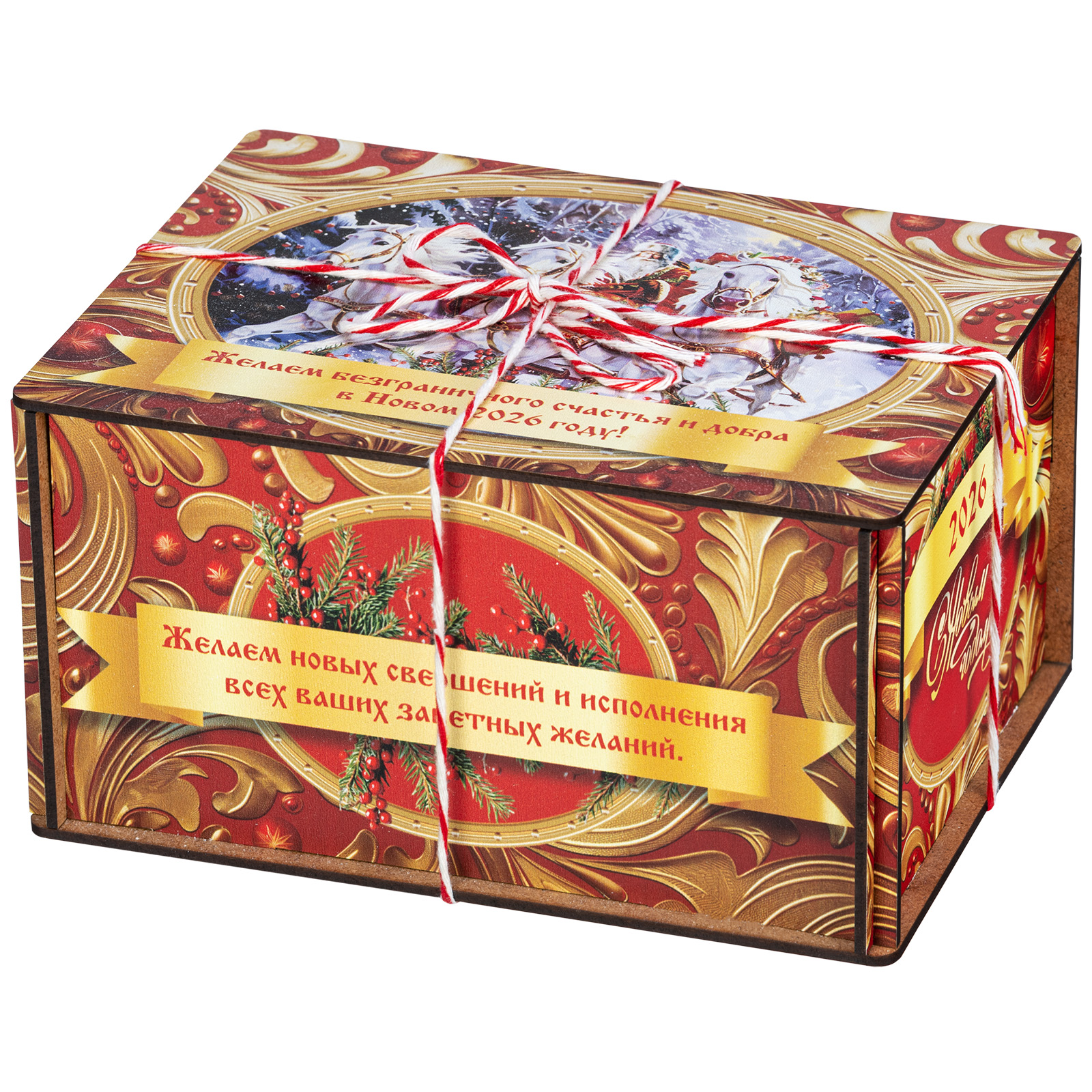 Ищете новогодний сладкий подарок подростку или взрослому? Присмотритесь к набору “Золотые узоры” - это оригинальный конфетный набор в яркой упаковке. В подарок входит килограмм вкусных и разнообразных кондитерских изделий от ведущих фабрик, а также небольшой памятный сувенир в виде символа наступающего 2026 года. Сладости бережно упакованы в небольшой деревянный ящик, выполненный в сочетании золотого и красного цветов. На крышке есть небольшая иллюстрация с изображение Дедушки Мороза в упряжке белых грациозных лошадей. Упаковка аккуратно перетянута цветной ручкой шнурком, что еще больше добавляет ей привлекательности.